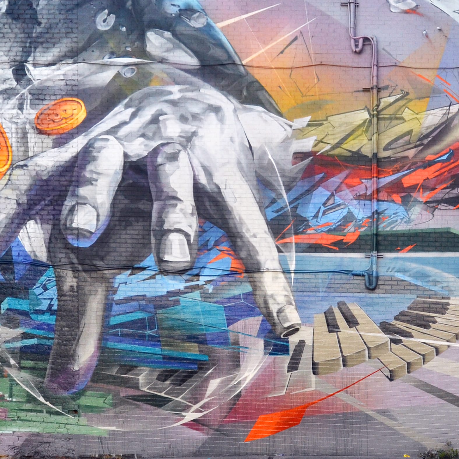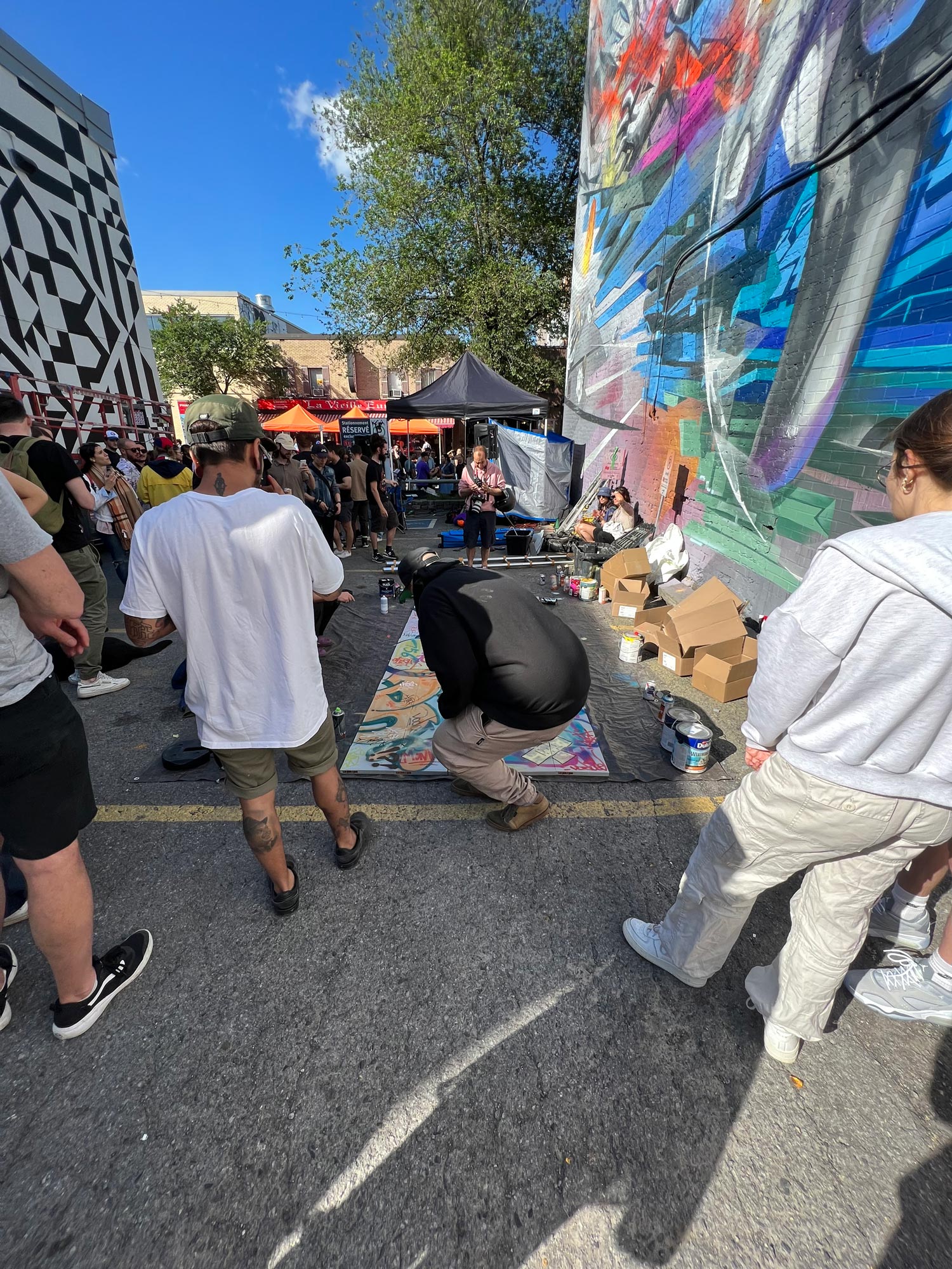 Sous les yeux des artistes à l’Å“uvre, le parking s’est transformé en piste de danse. Reprenant les codes des “block party” improvisées lors des jams graffiti des années 90, les curieux s’arrêtent non seulement pour voir une murale imposante prendre forme, mais aussi pour assister à des performances musicales permettant à de nombreux artistes de la scène montréalaise d’animer l’espace.